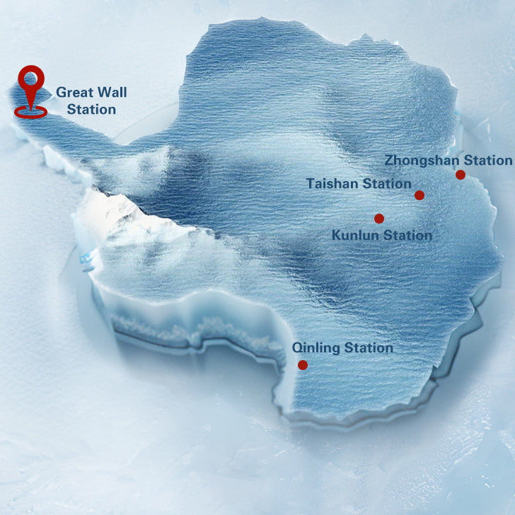 Underneath the deep purple luminous lies a hidden mystery. Quietly revealing the outline of the Antarctic continent and the locationsof five Chinese Antarctic scientific research stations